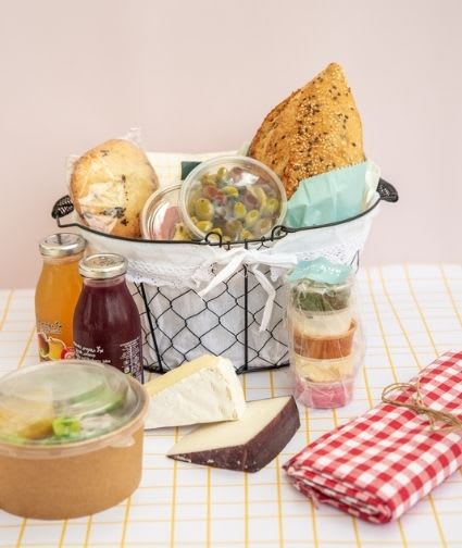 סל פיקניק מפנק עם מבחר גבינות וכל מה שאתם צריכים לפיקניק בטבע.